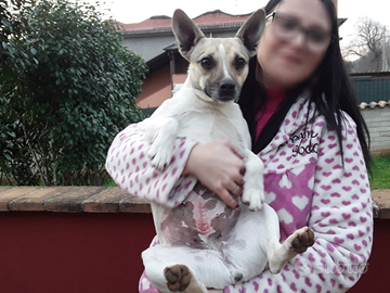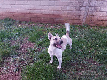 Bellissima, probabile mix bouledogue francese - jack russel, è piccolina ma con una carica esplosiva! Un "cane molla", affettuosissima e giocherellona. Curiosa e scattante, ideale amico a 4 zampe per chi è dinamico e sportivo ma anche compagno perfetto per godersi il divano nei momenti di relax.