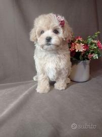 Cagnolina, cucciola, razza maltipoo, pelo bianco champagne. occhi scuri ed espressione dolcissima. Adatta a famiglie ed amanti degli animali. Ottima compagnia per le persone anziane. Ultimo esemplare disponibile. Età 2 mesi e mezzo è vaccinata, sverminata e microchippata. L'abbiamo iscritta all'anagrafe canina ed il passaggio di proprietà verrà da noi eseguito rilasciandovi la relativa documentazione insieme al libretto sanitario. E' trattata con antipulci. Kit cucciolo in omaggio Presso la nostra struttura potrete visionare mamma e papà RICHIESTA EURO 800.00 MASSIMA SERIETA' E COMPETENZA ASTENERSI PERDITEMPO E SE SERIAMENTE INTERESSATI CHIAMARE IL CELL 350 001 47 95 NO MESSAGGI GRAZIE