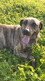Splendido mantello tigrato scuro; probabile mix Bardino Majorero (cane delle Canarie noto per fedeltà e sensibilità).
