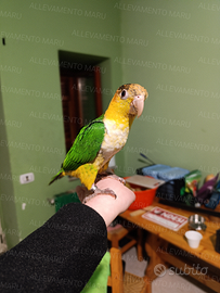 Disponibile caicco testa gialla allevato a mano, svezzato da circa un mesetto. Anellato, con cites e sessaggio. I caicchi sono pappagalli buffi e coccoloni e sono meno rumorosi di molte altre specie