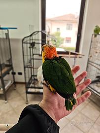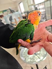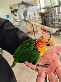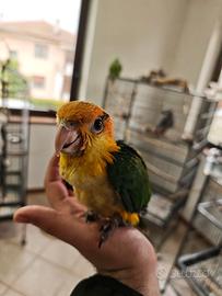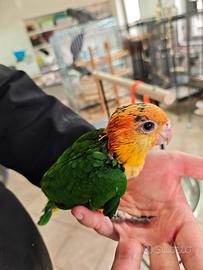 Stupendo ultimo esemplare di caicco testa gialla arancio al momento ha 1 mese, possibilità di imbeccarlo o di ritirarlo svezzato soggetto italiano, anellato, con documenti originali stupendo e bellissimo con grandi e piccoli bambini allevato a mano con amore disponibili gabbia, accessori e tutto il necessario oltre che supporto costante caicco, pappagallo,