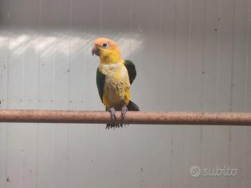 disponibile giovane caicco testa gialla sessato maschio anno 2025 allevato dai genitori , pertanto adatto alla riproduzione.