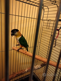 Caicco testa nera e stato allevato a mano poi messo in gabbia da riprendere ,ha due anni perfetto di piumaggio non sessato ,documentazione regolare con anello ,eventualmente accetto scambio con altro pappagallo ,Consegna a mano no spedizioni e no perditempo cedo a300 euro no trattabili ,max venezia