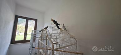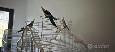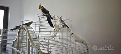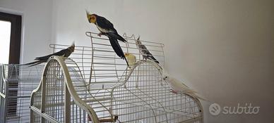 Secondo coppia maschio lutino - femmina perlata faccia bianca. I maschi cantano entrambi il motivetto della famiglia Addams e altri. Più giovane pullo di pochi mesi. Bellissima gabbia 168*80*60 ottime condizioni e due nidi perfetti per le coppie. Calopsite docilissime! Allevate a mano, seguono e tornano in gabbia. Non sono selvatiche