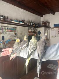 Quattro calopsitte allevate a mano che saranno svezzate tra 10-15 giorni. Due ancestrali e due perlate, stella, stellina, perla e perlina.