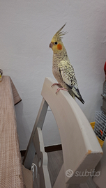 Calopsite di 7 mesi allevata a mano e anche dai genitori,penso sia femmina perché non canta non fischia, non è sessato. Genitori papà ancestrale e mamma lutina