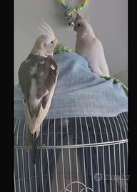Coppia di calopsiti la bianca femmina il maschio bianco pezzato molto affettuosi allevati a mano !! Li vendo per motivi di lavoro !! Il maschio canta !! L'inno d'Italia !!pirata dei Caraibi!! La cucaracha !! La famiglia Adams!! Sono molto coccoloni !! Quando li chiamate col nome vengono sia sulla spalla che in mano !!