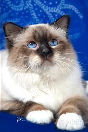 Maschio di razza Sacro di Birmania disponibile per monte/accoppiamenti. Il gatto, a solamente 20 mesi, era già diventato un pluricampione alle esposizioni. Il soggetto attualmente ha già conseguito i titoli di: Campione Italiano, Campione Internazionale e Gran Campione Internazionale. Tutto questo a nemmeno 2 anni di età! Ora il maschietto ha 28 mesi e sta proseguendo la sua carriera espositiva con successo. Soggetto di altissima genealogia, perfettamente aderente allo standard di razza. Eventuali femmine presentate per l'accoppiamento, dovranno essere perfettamente in regola con le certificazioni sanitarie. In particolare, non si renderà disponibile il gatto per accoppiamenti con femmine sprovviste delle regolari vaccinazioni, comprensive di FILV e FELV. Il prezzo richiesto per la monta è molto interessante, se rapportato alla qualità del soggetto maschile. Se la femmina è di altissima qualità, si valuta l'alternativa cucciolo/i. Astenersi perditempo.