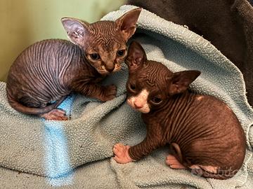 Disponibili due cucciole femmine di Canadian Sphynx, una nera tigrata e una nera e bianca. Si consegnano a fine svezzamento con sverminazioni, ciclo vaccinale completo, microchip, visita veterinaria con analisi feci e test giardia effettuati appena prima di andare nella nuova famiglia, pedigree, kit cucciolo. I genitori sono testati annualmente per le malattie infettive e per le principali malattie ereditarie. I gattini nascono e crescono in famiglia, vengono ben socializzati e abituati a convivere con altri gatti e con i cani. Vengono abituati al bagnetto e alla toelettatura fin da piccoli. Siamo un piccolo allevamento regolarmente registrato FIFE, garantiamo qualità e assistenza per tutti i cuccioli che cediamo. Possibilità di consegna, per alcune zone gratuita.