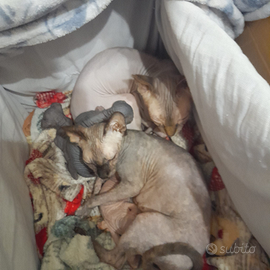 Due piccolini di Canadian Sphynx ( maschio blu e femmina colore crema) cercano una famiglia che possa amarli e coccolarli!!! Gattini verranno consegnati con visita veterinaria completa ( libretto sanitario, sverminazione e primo vaccino) Nati il 20 gennaio 2026, saranno pronti per andare in un'altra famiglia primi giorni di aprile. Il genitore di cuccioli e di mia propieta, sono testati ed esenti da FIV FELV HCM. Non PEDIGREE. WhatsApp 348 004 4817