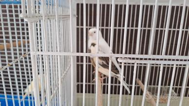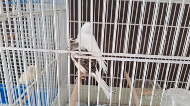 Vendo 3 canarini. Il bianco è 8arh maschio Quella pezzata è femmina Quello sul giallino è il figlio nato quest'anno