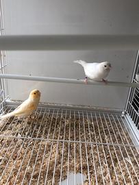 vendo splendida coppia affiatata di canarini prontissimi per la riproduzione femmina bianco recessiva canterina estremamente selezionata e maschio giallo mosaico selezionato per lo splendido canto. Cedo in coppia a 60€ oppure solo femmina: 40€ solo maschio 30€ Alta genealogia, ottimi riproduttori e linea di selezione perfetta