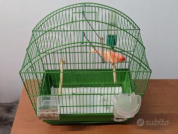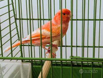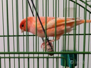 Vendo canarino femmina anellato FOI 2024 con gabbietta in metallo verde con vassoio in plastica estraibile e completa di mangiatoie e beverino. Ottime condizioni