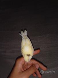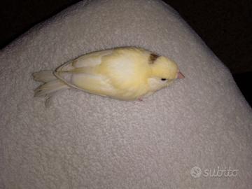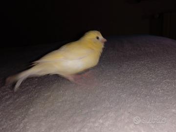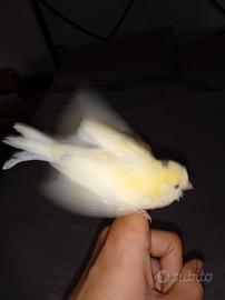 Canarino giallo /bianco con macchietta marroncina sulla testa allevato allo stecco non ha nessuna paura dell uomo anzi vede una mano vola per stare sul dito