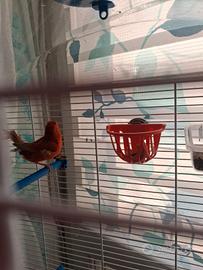 Canarino rosso maschio del 2025 + gabbia grande con tanti accessori e vari alimenti. Il Canarino gode di ottima salute. Ve do causa gatto
