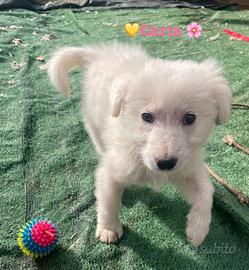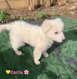 Carla è una cucciola femmina di circa 2 mesi e mezzo, dal pelo lungo e di colore bianco.