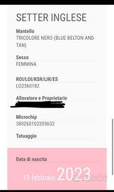 Setter inglese femmina con pedigree in foto, madre e padre campioni italiani di lavoro, avviato alle gare fino ai 2 anni, a quel punto mi è stato ceduto. Per mancanza di tempo la stagione passata non è stata utilizzata e quindi fuori allenamento. Non assicuro me ferma né consenso al momento solo obbedienza, deve essere allenata e addestrata. Il prezzo è simbolico mi dispiace non poterla utilizzare e la cederei sia ad un cacciatore che non, chiedo solo sia trattata bene e che gli sia assicurato del movimento.
