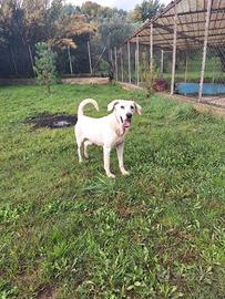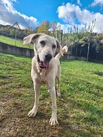 Maschio, nato presumibilmente nel 2017, taglia medio abbondante. Carattere: dolcissimo con le persone, nessun problema di manipolazione, cammina perfettamente al guinzaglio.