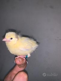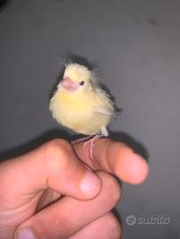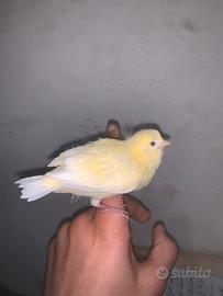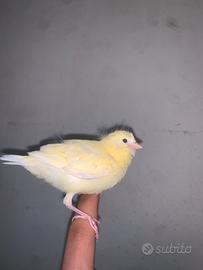 Canarino giallo/bianco pezzato allevato a mano. In perfetta salute. Deve ancora fare il primo cambio di piume ha 23 giorni. Disponibili video e foto della crescita.