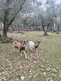 Due caprette nane, giovani, femmine, mamma e figlia, abituate al contatto con altri animali e persone, si lasciano accarezzare. Sono a Canale Monterano, Roma.