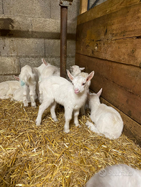 Capretti maschi e femmine di razza saanen esenti caev e pseudotubercolosi nati a febbraio, genitori visibili in azienda.