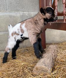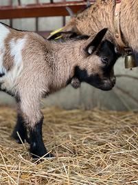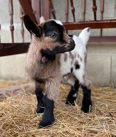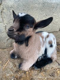 Artú, dolcissimo capretto nano. Mantello sauvage anteriore, su bianco maculato. Abituato al contatto con le persone. Si cede allo svezzamento, sverminato e vaccinato per coccidiosi. Genitori visibili su richiesta.