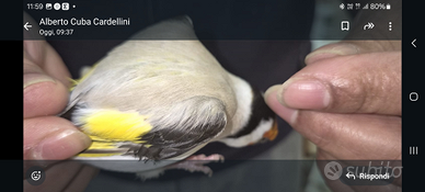 Vendo cardellini major ottima taglia varie mutazioni, un maschio agata portatore di satinè a 150euro, una coppia formata da maschio eumo e femmina satinè prezzo 400euro, tutti i soggetti sono in buona salute e sono tutti nati nel 2024. Per altre foto od informazioni contattare Alberto dopo le 14,30 al 348 841 1801 .