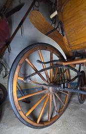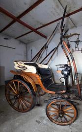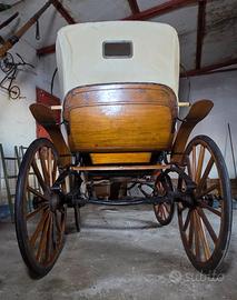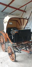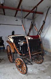 2 posti con divanetto in pelle, serpa anteriore per cocchiere, 4 ruote gommate in legno e parafanghi posteriori in legno.