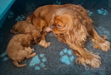 Disponibili alla prenotazione due cucciole di Cavalier king charles spaniel ruby con pedigree e affisso enci. Le cucciole hanno 40 giorni e saranno consegnate dal 20 febbraio in poi con microchip, 2 vaccini, 2 sverminazioni, libretto sanitario, iscrizione ad anagrafe canina, passaggio di proprietà, certificato di salute, croccantini puppy. Le cucciole hanno importanti linee di sangue e sono figlie di genitori testati ed esenti da patologie (consegno copie certificazioni di occhi, cuore e rotule nonchè test genetici clear). Le cucciole sono allevate in ambiente domedtico e sono abituate a bambini e altri animali. Si fornisce supporto nell'inserimento nel nuovo ambiente domestico e nella crescita delle cucciole. Trasporto possibile con corriere autorizzato. Cucciole e genitori sono visibili contattando il numero 320 3157031