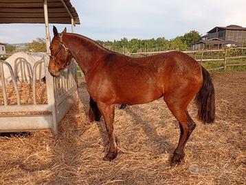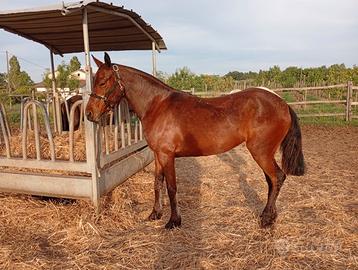 Splendida puledra baio ciliegio figlia di stallone Frisone sport x cavalla Araba linea lavoro di 4 anni nata e crescita allo stato brado.La puledra è pronta per la doma,sana e bella,movimenti stratosferici.Per info solo chiamate al 3474966175