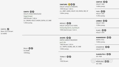 Vendesi cavalla italiana (altezza 167cm) con ottima genealogia da canto x dilla x canturo x ahorn del 2015 , viene venduta come FATTRICE. cavalla sana con lastre disponibili adatta anche a passeggiate o a essere montata (ha anche lei saltato fino alle 110) ma si vende come fattrice per il temperamento molto caldo, sono disponibili video recenti da montata e previo accordo si puo portare nel proprio centro per prove da montata, ha volendo buone prospettive nel salto (non guarda nulla ed è gia uscita in gara) ma necessita di un cavaliere robusto e paziente . Abituata a vivere fuori e già scalza, genitori e nonni che hanno saltato fino a 1.60m. Prezzo 4k TRATTABILE. Si trova in zona Lodi, trasporto possibile e incluso nel prezzo in caso di accordi, per info 3914060049. Ripubblico per sbagliata data di nascita.