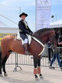 Splendido Stallone Pura Raza Española, 9 anni, 1,65 al garrese. Esemplare tipico spagnolo, morfologia corretta, presenza scenica e carattere equilibrato. Ha partecipato a gare di Dressage FISE fino alla categoria F, curriculum visionabile. Esperienza consolidata anche in fiere e spettacoli, esegue figure di alta scuola come piaffe e passo spagnolo.