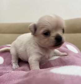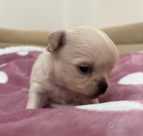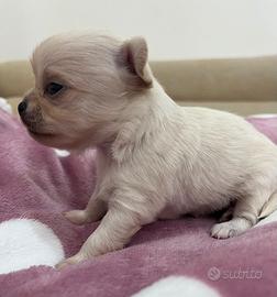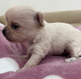 Chihuahua femmina pelo lungo color crema dolce e affettuosa da adulta arriverà a pesare sotto i 2 kg, visibile e prenotabile viene ceduta dopo i 60 gg sverminata, vaccinata chip e pedigree enci. Siamo a Roma