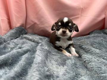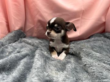 Billy, Chihuahua maschio con pedigree a pelo corto, colore cioccolato e bianco, gode di buona salute, genitori sani esenti da patologie genetiche (documentabili) età 3 mesi (nessun difetto) Tutto in regola, vaccini completi, pedigree, microchip, deposiito del DNA, sverminato, test giardia ecc, Carattere stupendo, adora tutti, molto affettuoso, non abbaia, abituato a sporcare sulle traversine. Compreso nel prezzo includiamo un kit cucciolo, corredino e consegna a domicilio gratis entro i 30 km dal nostro allevamento.Per maggiori info, contattatemi via WhatsApp, il prezzo non é trattabile, grazie per la comprensione.