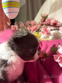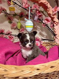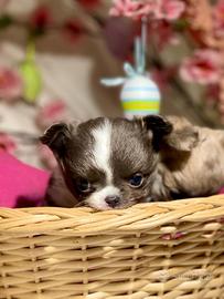 Chihuahua cucciolo blu e bianco pelo lungo
