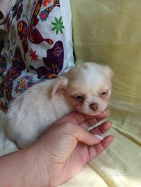 Disponibile una splendida cucciola femmina a pelo lungo color crema e champagne di 2 mesi con occhietti chiari. La piccola è nata e cresciuta in ambiente familiare a stretto contatto con altri cani anche di taglia grande, gatti e bambini. Rimarrà davvero di piccolissime dimensioni massimo 2 kg! Ha un carattere super dolce e affettuoso con tutti. I genitori sono di proprietà ed entrambi visibili, la mamma pesa 2,5 kg e il papà 1,6kg. Abituata a fare i bisogni sulle traversine. Verrà ceduta con libretto sanitario, attestato di buona salute, vaccinazione, sverminata, con antiparassitario e kit cucciolo.