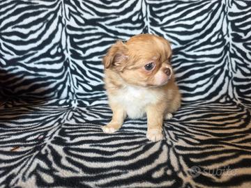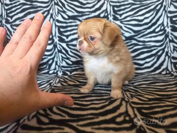 Chihuahua femmina pelo lungo Color beige e bianco con occhi chiari muso corto testa a mela zampa colorazione magnifica ... Nome Athena 70 giorni Pelo foltissimo una nuvola di pelo . La cucciola ha un carattere meraviglioso... Una vera meraviglia di madre natura dimensione mini Viene consegnata con : * Vaccinazione *Sverminazzioni completate *Microchip Italiano no (estero) * Certificato medico di buona salute *Kit alimentazione specifico Per ulteriori informazioni contattare Al 327 95 49 884 Giuseppe