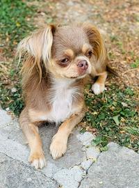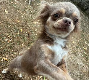 Chihuahua lilac tricolor pelo lungo 5 anni a marzo, sana, pedigree, microchip, regolarmente vaccinata, sverminata, proviene da un allevamento dalla Russia, intera, non sterilizzata. Morfologicamente perfetta ha solo un difetto di standard: supera i 3 kg. Pesa 4,7 kg. Carattere buona con tutti sempre alla ricerca di coccole. Convive senza problemi con altri cani femmine e maschi. Per lei solo una famiglia che riesce a darle tanto tanto affetto e tempo