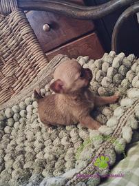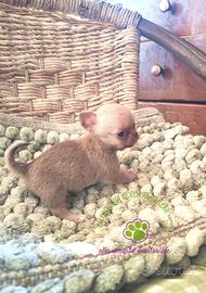 Chihuahua maschietto a pelo corto taglia minima dello standard per non dire toy, due mesi occhi chiari rarissimo colore ililac isabella piccolo di taglia corretto in tutto con Pedigree enci , kit cucciolo, libretto sanitario completo di vaccini, chip e sverminazioni , possibilità di consegna in tutta Europa , allevamento professionale tel. 3405282515