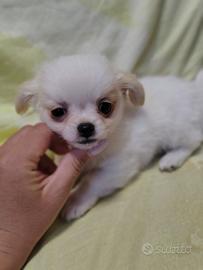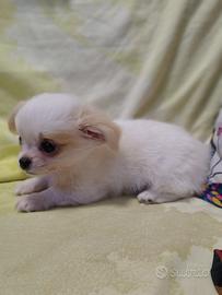 Disponibile uno splendido cucciolo maschietto a pelo lungo color crema di 2 mesi. Il piccolo è nato e cresciuto in ambiente familiare a stretto contatto con altri cani anche di taglia grande, gatti e bambini. Rimarrà davvero di piccolissime dimensioni massimo 1,5/2 kg! Ha un carattere super dolce e affettuoso con tutti. I genitori sono di proprietà ed entrambi visibili, la mamma pesa 2kg e il papà 1,6kg. Abituato a fare i bisogni sulle traversine. Verrà ceduto con libretto sanitario, attestato di buona salute, vaccinazione, sverminato e con antiparassitario.