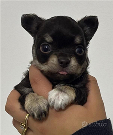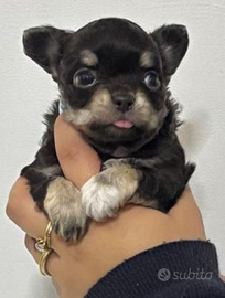 Disponibile ultimo cucciolo maschio chihuahua pelo lungo choco tan tricolor figlio di papà lilac e mamma crema entrambi a pelo lungo. nato il 4 novembre sarà disponibile dal 5 gennaio. visibile da subito. viene ceduto con microchip, due vaccini, due sverminazioni, libretto sanitario, certificato di buona salute ed esami feci e giardia negativo.