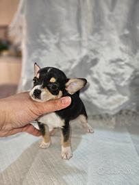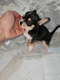 Disponibile in Allevamento cucciolo di chihuahua tricolore nero/bianco/crema che si consegna a due mesi, a febbraio. Consegna effettuata di PERSONA in tutta ITALIA.