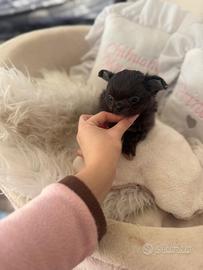 Lian, bellissimo maschietto di chihuahua a pelo lungo di colore blu con qualche macchia bianca.