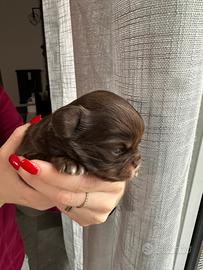 Chihuahua a pelo lungo chocolate tan maschio, nato il 27 dicembre, disponibile ai 60 giorni con chip, vaccino, sverminato, libretto sanitario, iscrizione anagrafe canina, passaggio di proprietà.