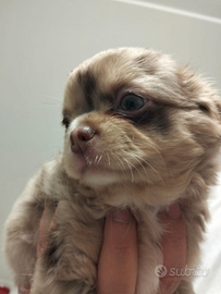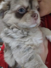 Bellissima chihuahua merle occhi chiari di 60 GG compiuti ..nata in un ambiente familiare genitori di nostra proprietà visibili. .molto dolce giocherellona pronta per una famiglia che la accolga con amore .