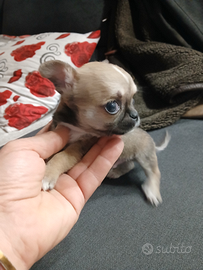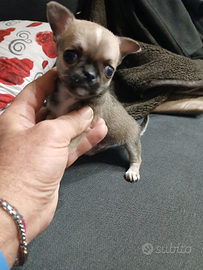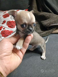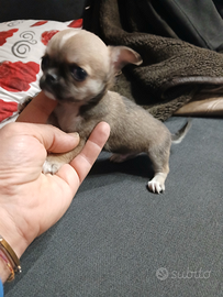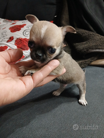 Chihuahua toy taglia piccolissimo da adulto un kilo e 6 di due mesi Svezzato e sverminato Si cede con vaccino e libretto sanitario Abituato alla traversina Solo persone amanti animali No perditempo No affaristi ....