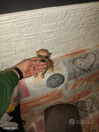 Mini cucciolo di chiwawa Toy maschio di due mesi completamente sverminato e con primo vaccino e libretto sanitario che attesta la ottima salute del cucciolo, molto intelligente e e socievole con tutti, abituato alla traversina, da adulto verrà molto piccola max un chilo e sei, cedo solo a persone serie e realmente interessate al cucciolo, no affaristi e perdite di tempo grazie.