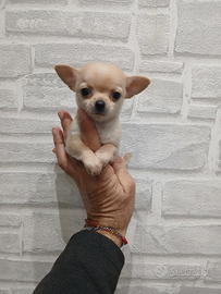 Chihuahua toy taglia piccolissimo da adulto un kilo e 6 di due mesi di vita Svezzato e sverminato Si cede con vaccino e libretto sanitario Abituato alla traversina Solo persone amanti animali No perditempo No affaristi ....
