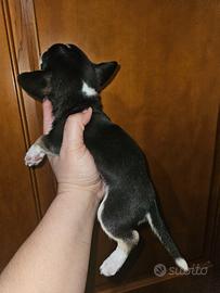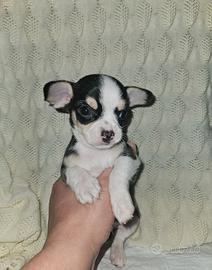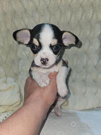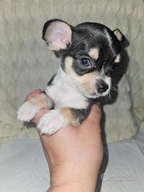Disponibile in Allevamento cucciolo di chihuahua tricolore nero/bianco/crema che si consegna a due mesi, a febbraio. Consegna effettuata di PERSONA in tutta ITALIA.