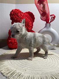 Disponibile bellissimo esemplare di chihuahua toy maschio a pelo raso colorazione rara e introvabile Lilac merle occhi chiari di 70 giorni . Giocherellone e vivace, ma anche molto coccolone . Ha un carattere che si adatta con altri cani di qualsiasi genere .